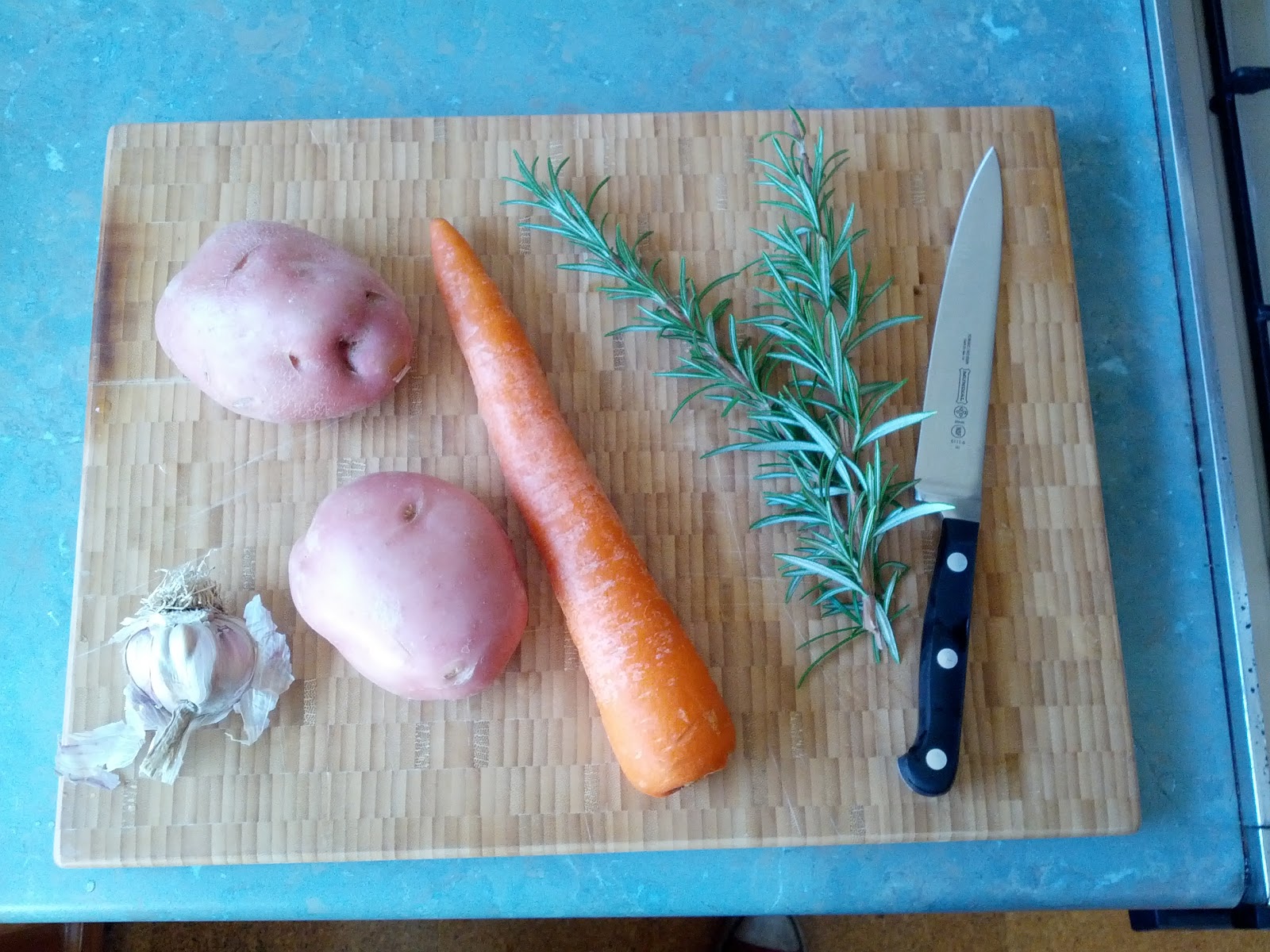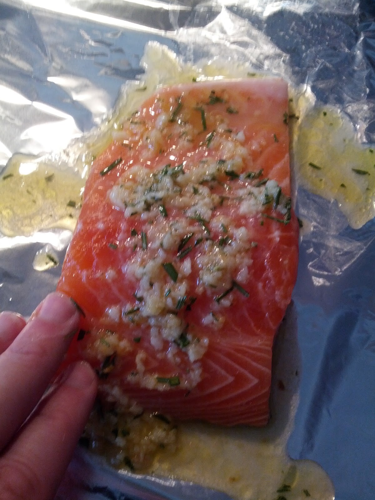 Being a non meat eater (but an eater of fish) we tend to have a lot of fish dishes, and salmon is my favorite variety. This is an adapted recipe for a garlic and rosemary baked salmon served with mash, the original idea was found here, but as you can see, I didn’t follow that recipe much at all. My recipes tend to be rather vague with a good amount of ‘until it looks right’ steps.
