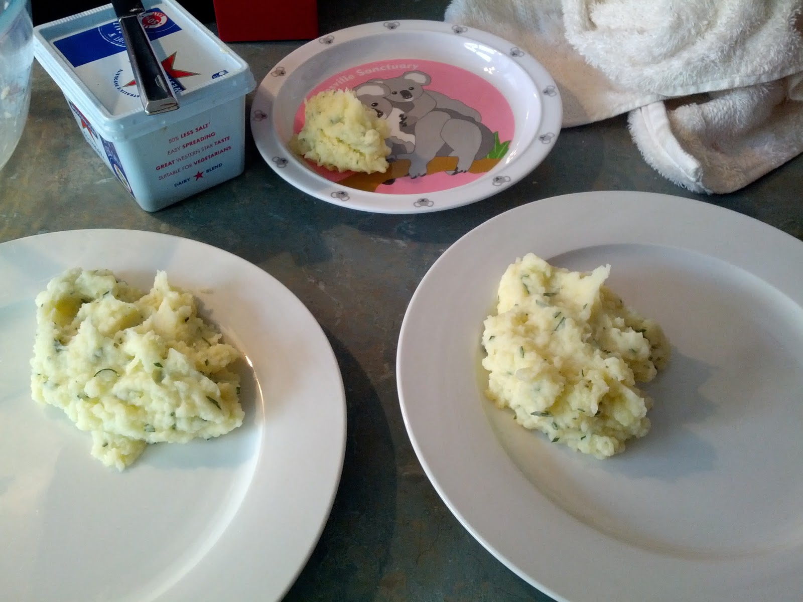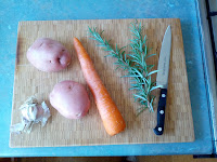 There are many good recipes for mash, so this section could just say, make some mash, and add the chopped rosemary, but for completeness… Take 2 good sized potatoes, we prefer desiree Desiree, peel, chop, and boil until soft. Add 1 sprigs worth of chopped rosemary, milk, and butter, salt, and pepper. Then mash until mashed.