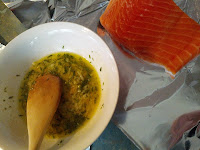 Take the fish and coat on both sides with the marinade. Wrap in foil, pouring any remaining marinade over the top before sealing. Bake for 15-20 mins in medium oven, our oven loses a lot of heat, so your milage may vary.