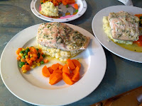 I served with steamed carrots and honey glazed peas, although this time we didn’t have any peas, so they were actually honey glazed peas, corn, and carrots.